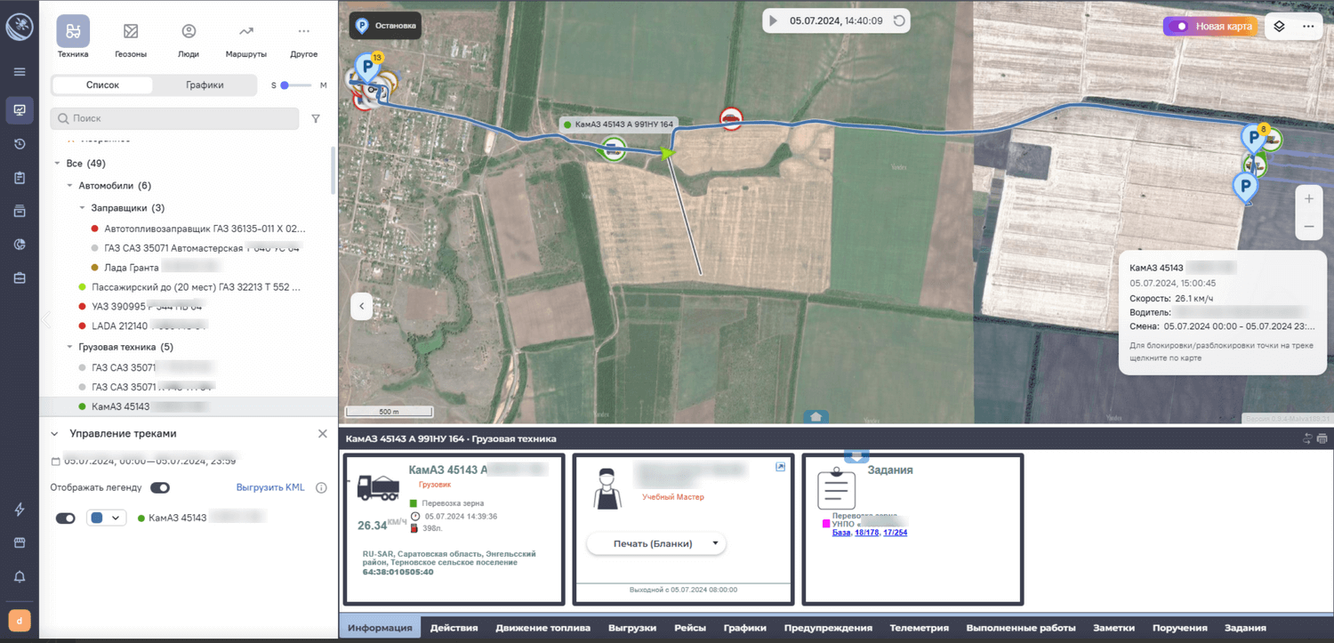 Платформа позволяет отслеживать местоположение техники, маршруты, пробег и время в движении. Все данные обновляются в реальном времени, а на карте видна полная картина передвижения транспорта и показателей любых подключенных датчиков в графическом виде.